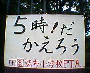 多摩川駅の周辺は、暗くなりはじめると、ものすごい勢いで暗くなります。以前、小生が働いていた会社は、残業の寮がものすごくて、「5時だ!残業」という看板が、職場の人々の心に貼り付けてありましたが、それはそれとして、田園調布小学校のPTAさまが張ってくれているこの看板は、暗くなったら帰ろう、という、大事な事を、私たち大人にも、いまさらながらに教えてくれています。